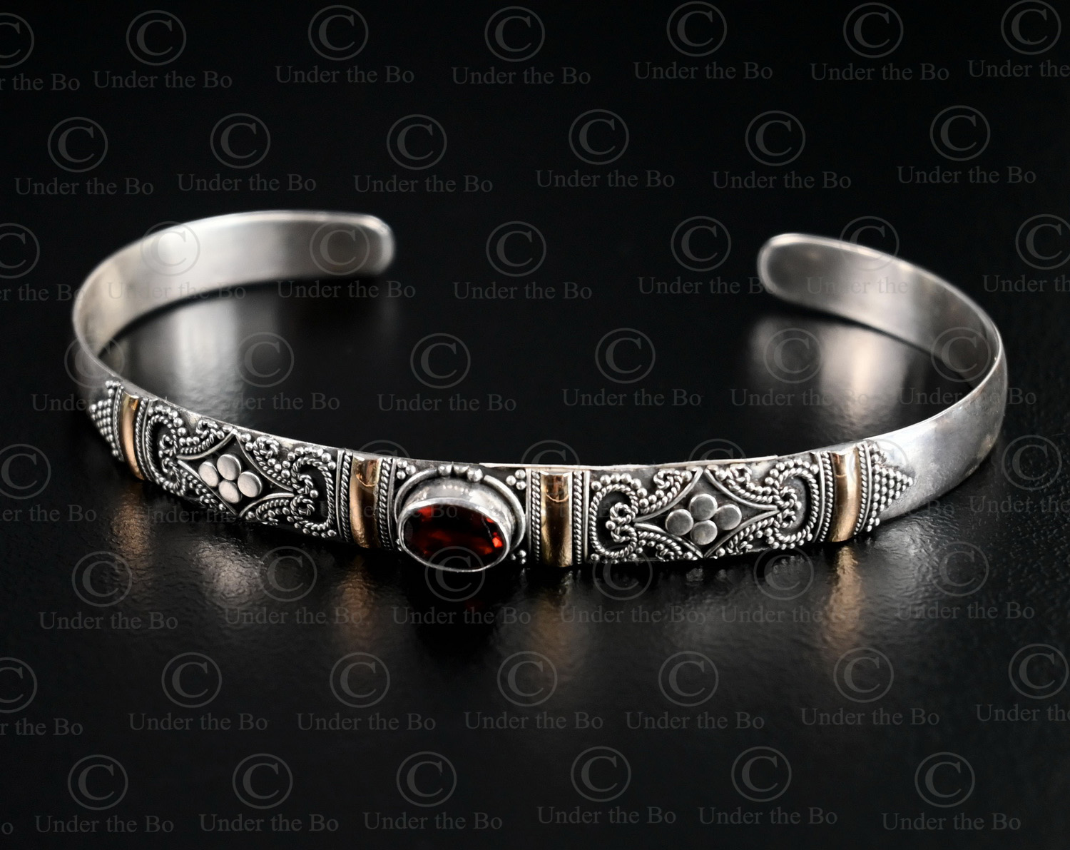 Silver bracelet made of tiny granulations and filigree, decorated with four gold plated strips and set with a garnet in its central part.