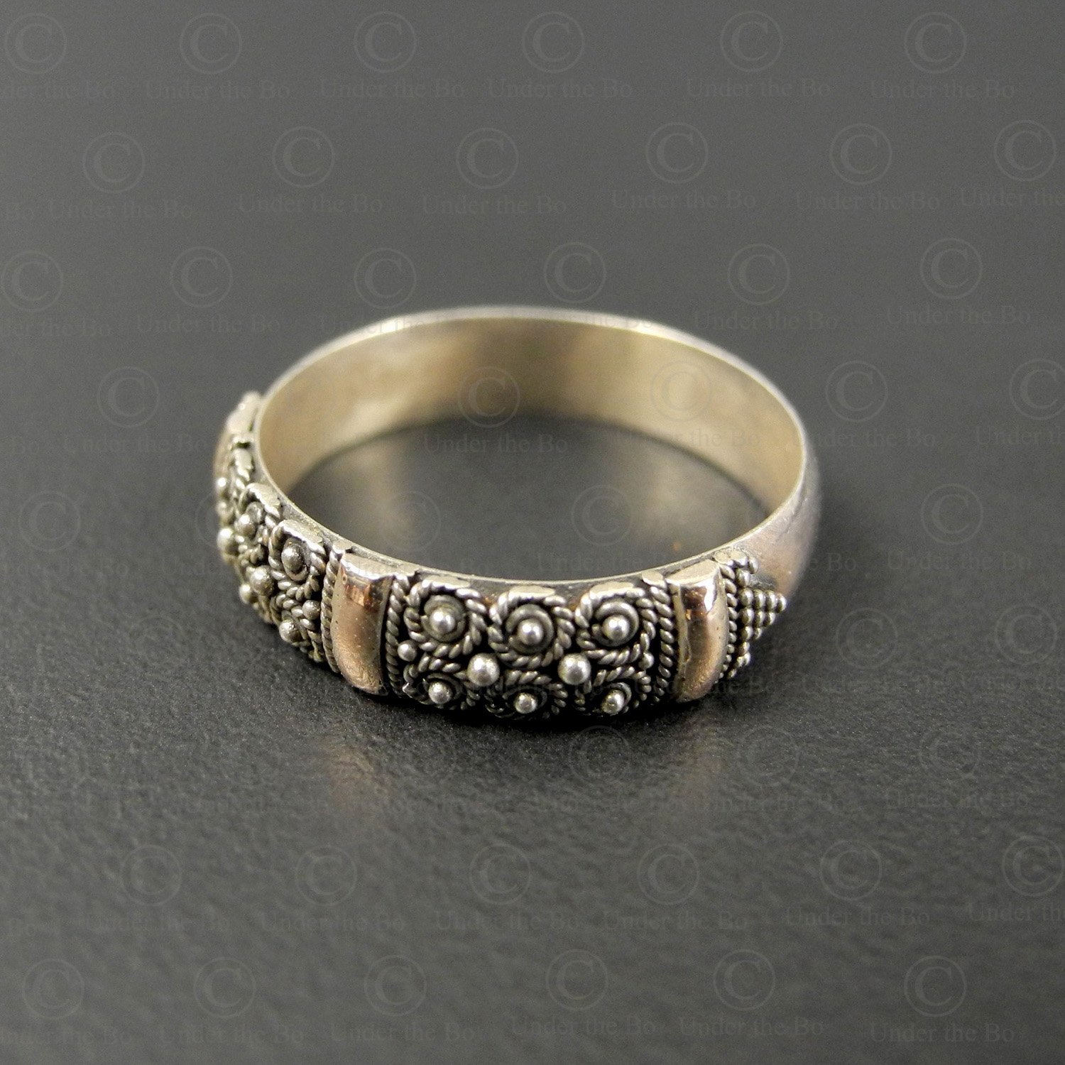 Silver ring made of tiny granulations and filigree, decorated with three gold plated strips.