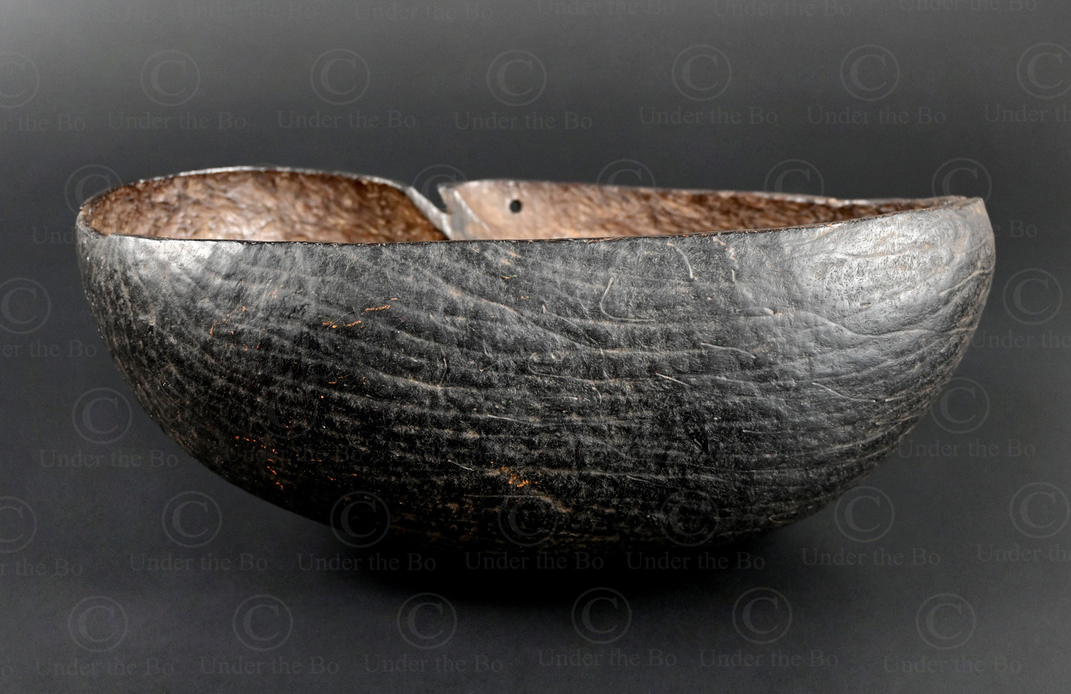 Simple alm bowl made of half coco de mer, used by a wandering ascetic of Muslim Sufism.
