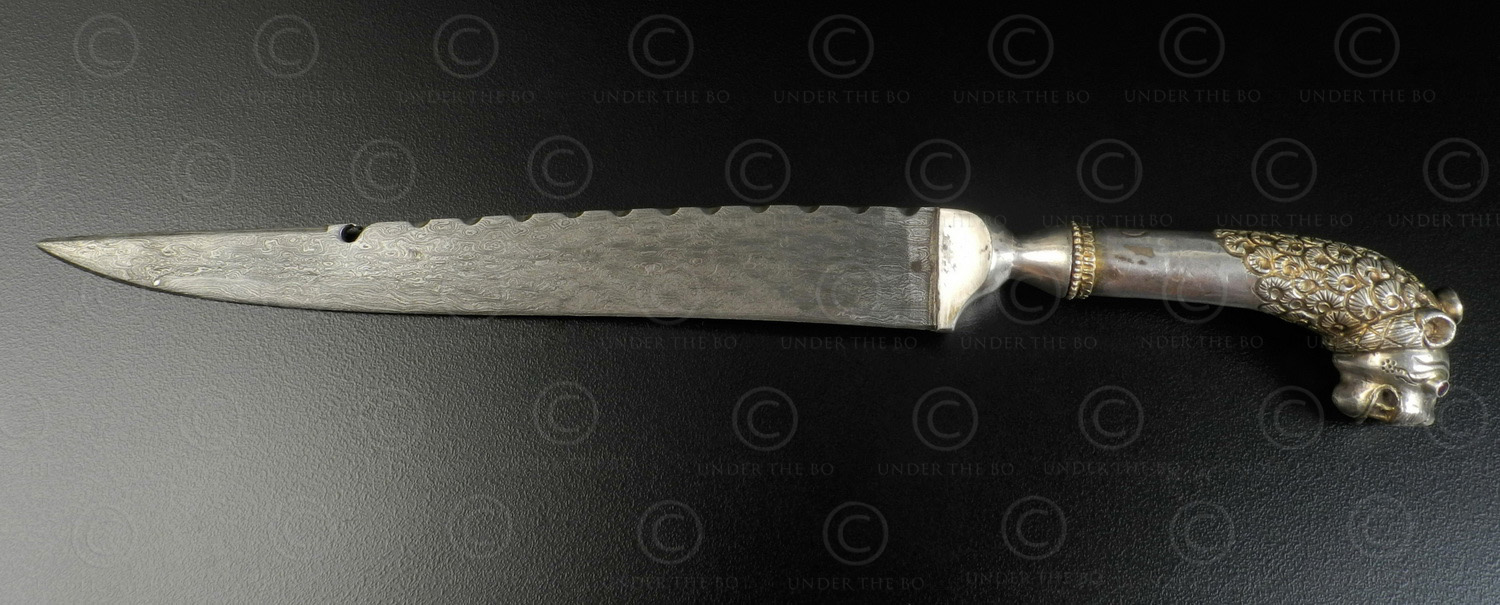 Dague à manche en argent en forme de tête de lion, qui a été doré, et dont les yeux ainsi que la couronne sont sertis d’améthystes. Elle est dotée d’une lame damasquinée et dentelée.