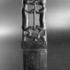 Épée de métier à tisser en bois de fer, servant à tasser les fils de trame. À une extrémité, une sculpture représente un homme soutenant deux aso (chiens-dragons) qui soutiennent eux-mêmes deux chiens.
