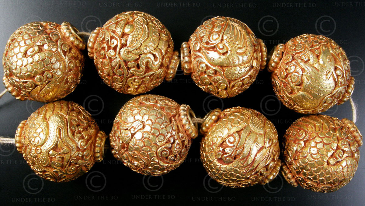 Engraved Buddhist beads BD121F. Handmade in Nepal. underthebo November 26, 2016 Engraved Buddhist beads BD121F. Lot of eight gilded brass beads, engraved with floral, mythical animals and volutes designs. Handmade in Nepal. Total weight: 158 gr. 29 cm long each.