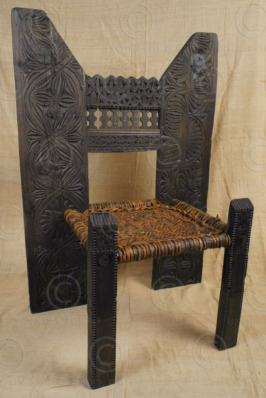 Swat chair SWF1B. Carved cedar wood chair with braided leather. Made out of old architecture or furniture elements at Under the Bo workshop. Swat valley, Pakistan. Contemporary, but with 19th or early 20th century elements. 77 wide x 108-40 high x 51 cm.