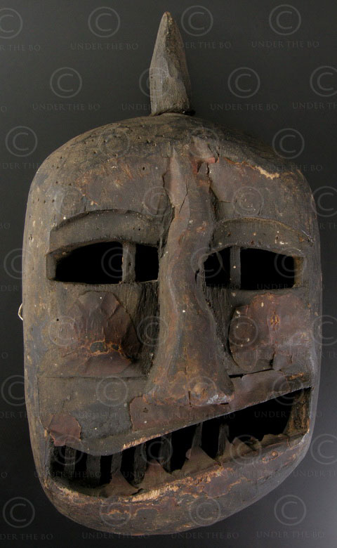 Yao Taoist mask LT3. Wooden mask with grimace to repulse sickness, with soot patina and glued paper. Lantien Yao minority. Northern Laos or Southern China. Early 20th century. 29 cm high x 16 cm wide.